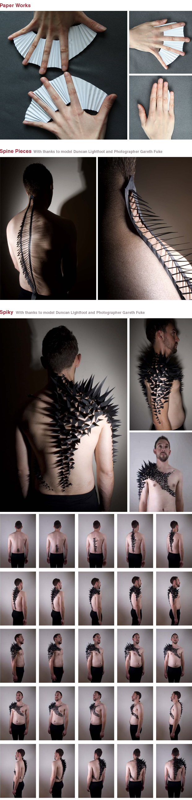 PAPER WORKS were developed as a fast and immediate way to explore sculpture and the body. I specifically wanted to understand the relationship between form, scale and the body. I did this by cutting papers into simple yet striking geometric shapes and using body glue as an adhesive.