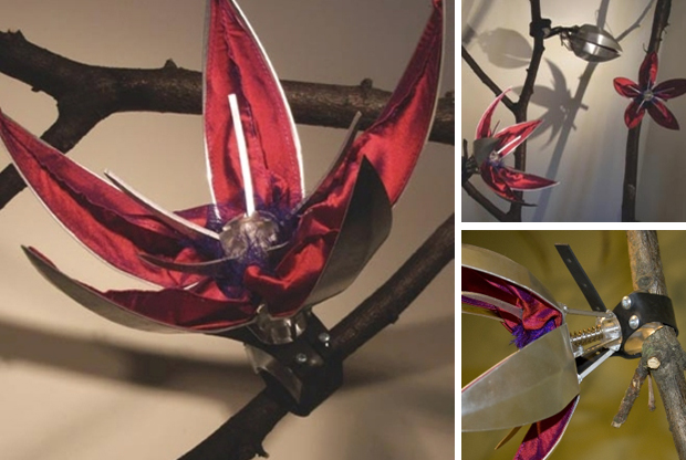 A 'make your own "Spring" kit'. A wooden box which opens to reveal a row of aluminium flowers, a row of clamps and a number of tools and 'detonation cables'. The flowers when closed appear to be cold and mechanical objects, but on removing a thorn from the stem, explode open to reveal a vibrant and rich raw silk interior.